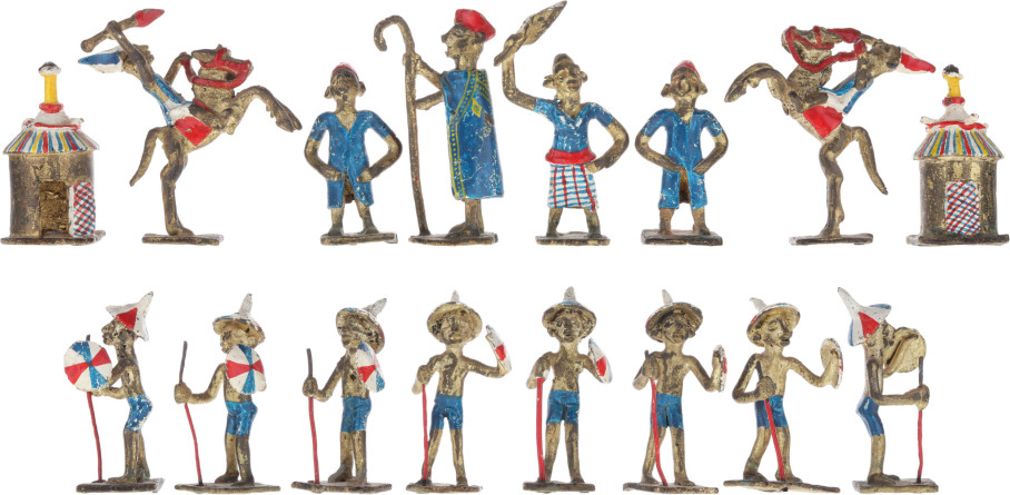 Messrs. Zimmermann and Malchow would likely have fainted at the sight of these chess pieces from Burkina Faso. A rough brass casting, boldly soldered onto a base and rather carelessly hand-painted – Art Brut for your chessboard.